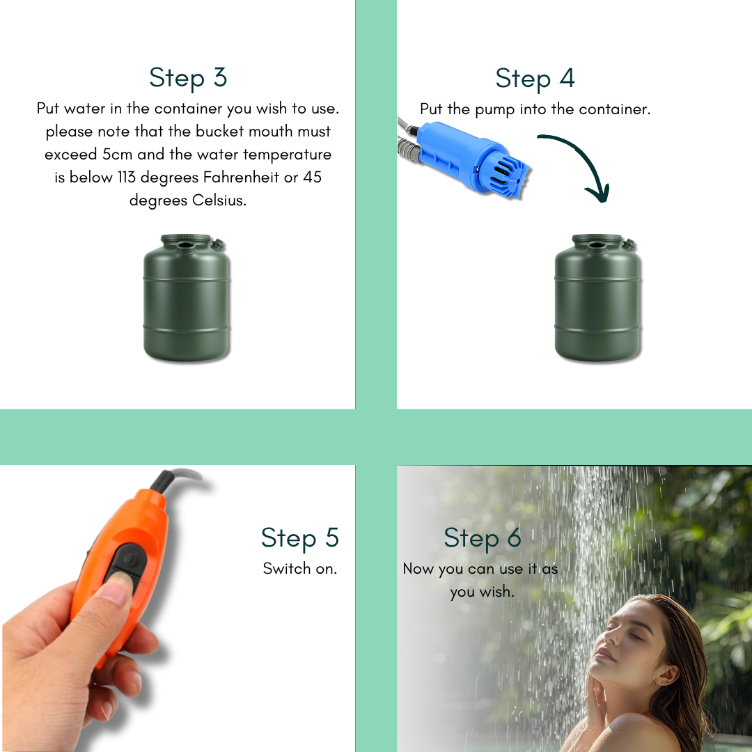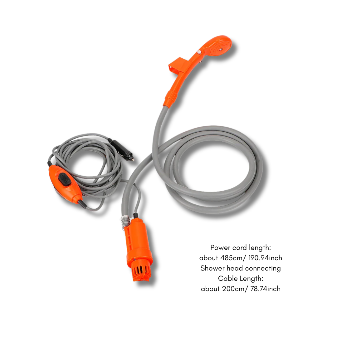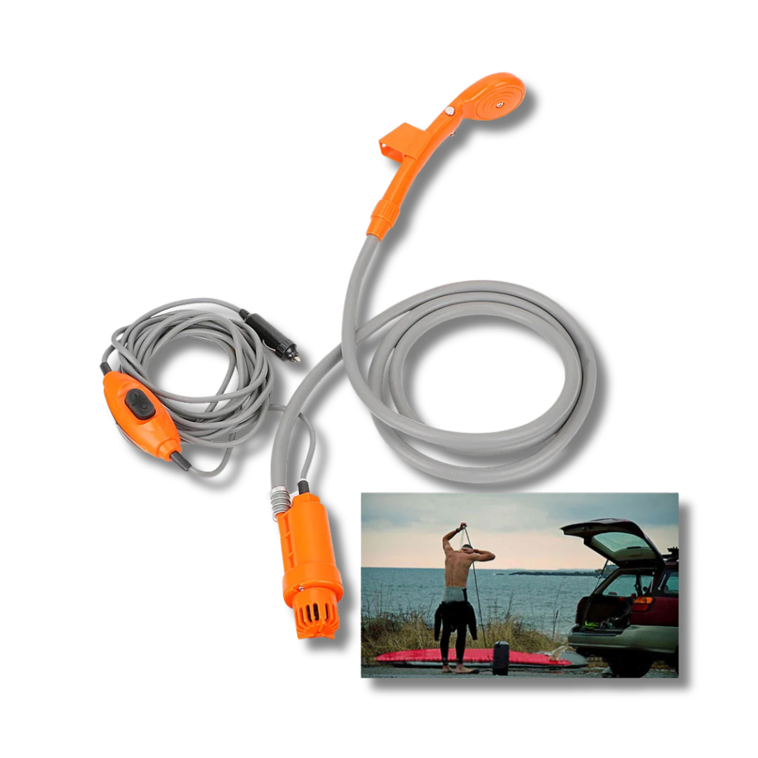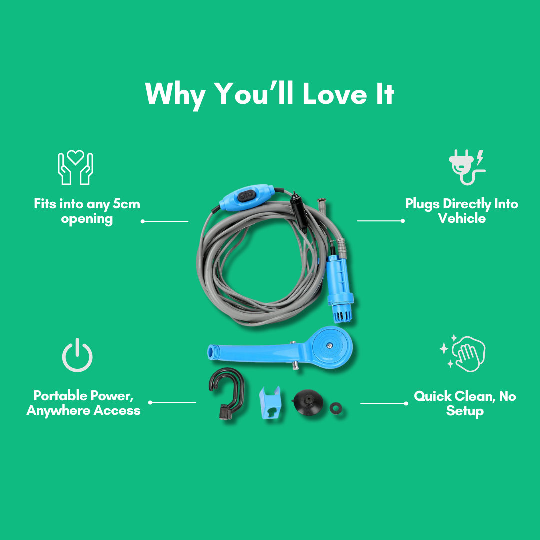 The CleanWave Portable Shower makes on-the-go washing effortless — just drop the pump into a water bottle and plug it into your car’s 12V power outlet for instant, pressurized water anywhere. Compact and convenient, it’s the ultimate travel essential for campers, adventurers, and road trippers.
